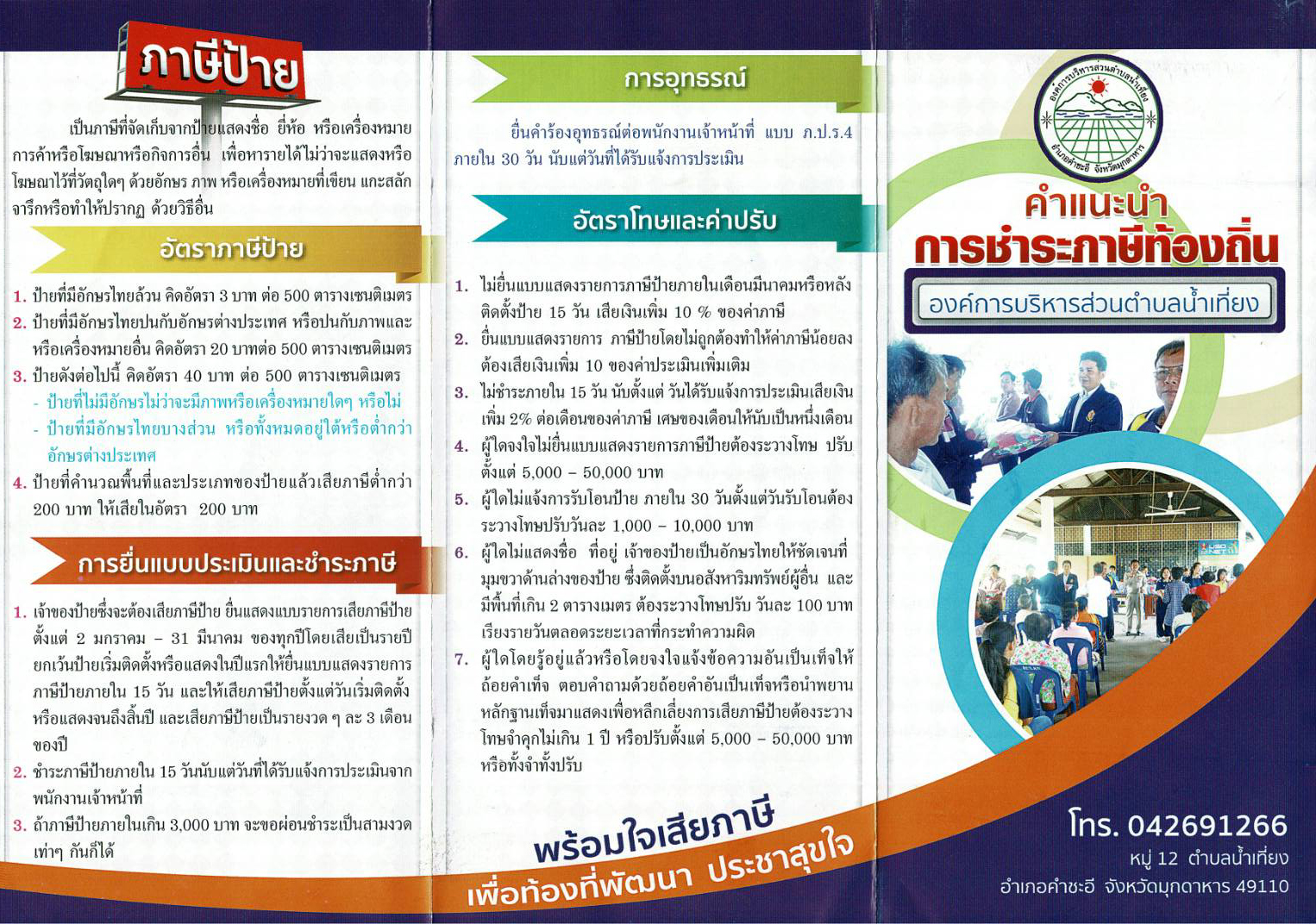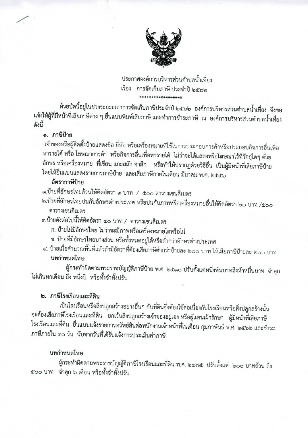 ขอแจ้งให้ผู้มีหน้าที่เสียภาษีต่างๆ ยื่นแบบพิมพืมพ์เสียภาษี และทำการชำระภาษี ณ องค์การบริหารส่วนตำบลน้ำเที่ยง