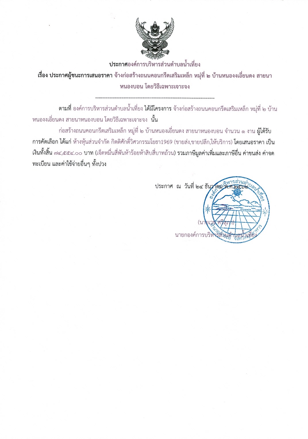 ประกาศผู้ชนะการเสนอราคา จ้างก่อสร้างถนนคอนกรีตเสริมเหล็ก หมู่ที่ 2 บ้านหนองเอี่ยนดง สายนาหนองบอน โดยวิธีเฉพาะเจาะจง