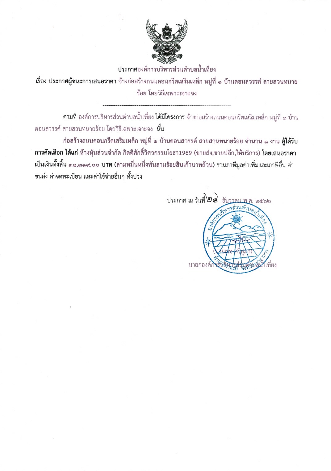 ประกาศผู้ชนะการเสนอราคา จ้างก่อสร้างถนนคอนกรีตเสริมเหล็ก หมู่ที่ 1 บ้านดอนสวรรค์ สายสวนทนายร้อย โดยวิธีเฉพาะเจาะจง