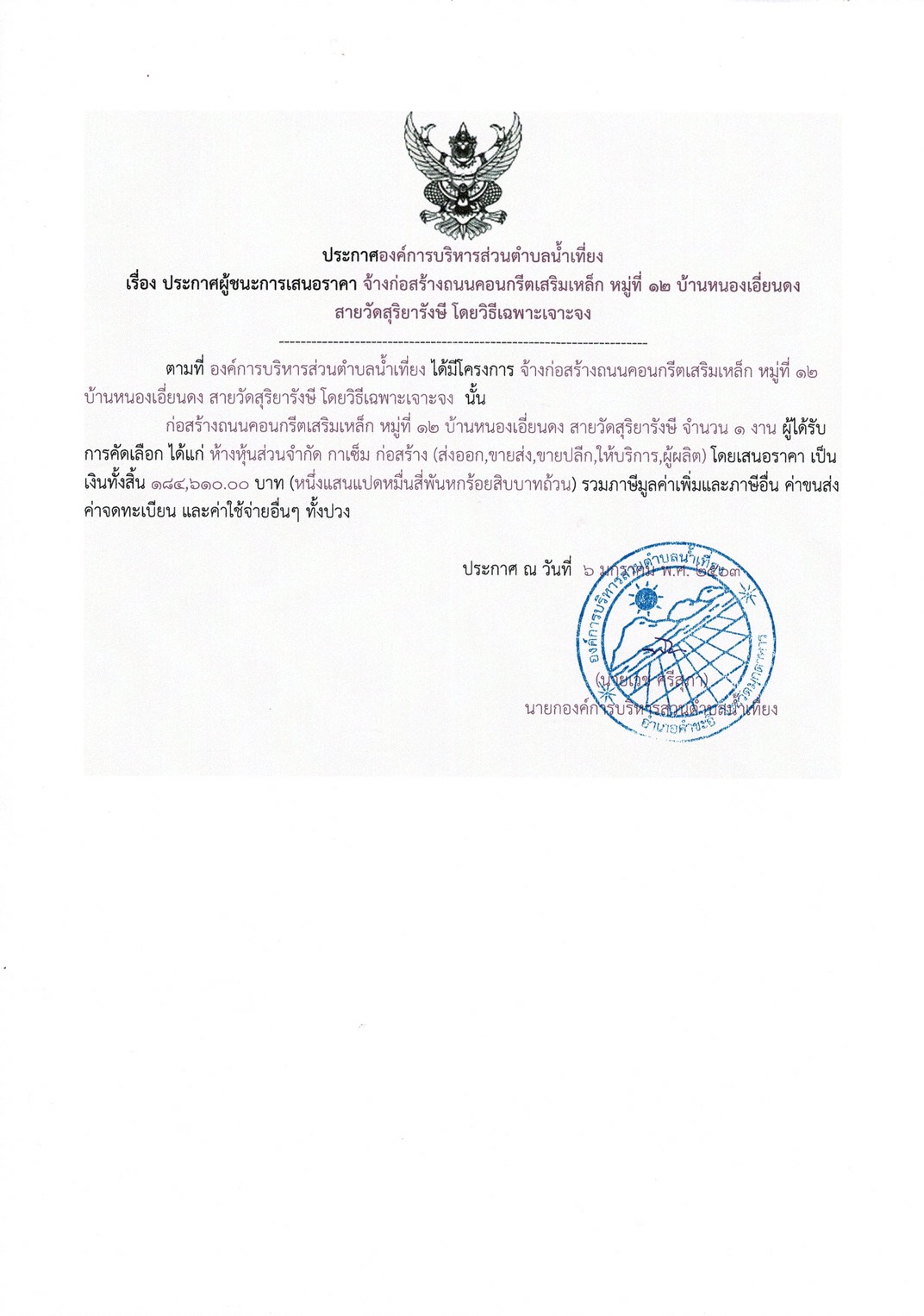 ประกาศผู้ชนะการเสนอราคา จ้างก่อสร้างถนนคอนกรีตเสริมเหล็ก หมู่ที่ 12 บ้านหนองเอี่ยนดง สายวัดสุริยารังษี โดยวิธีเฉพาะเจาะจง