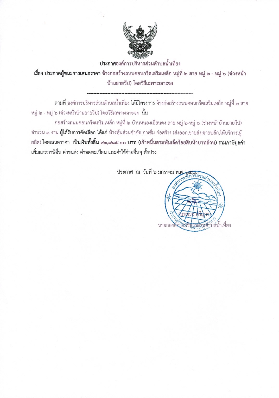 ประกาศผู้ชนะการเสนอราคา จ้างก่อสร้างถนนคอนกรีตเสริมเหล็ก หมู่ที่ 2 สายหมู่ 2 -หมู่ 6 (ช่วงหน้าบ้านยามวีป) โดยวิธีเฉพาะเจาะจง