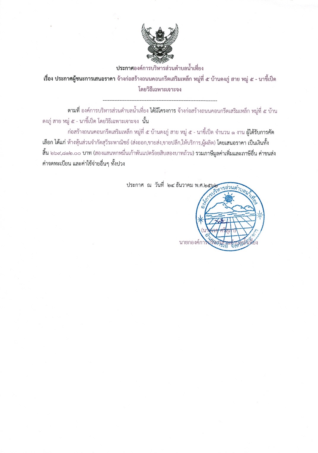 ประกาศผู้ชนะการเสนอราคา จ้างก่อสร้างถนนคอนกรีตเสริมเหล็ก หมู่ที่ ๕ บ้านดงภู่ สายหมู่ ๕ – นาขี้เป็ด โดยวิธีเฉพาะเจาะจง