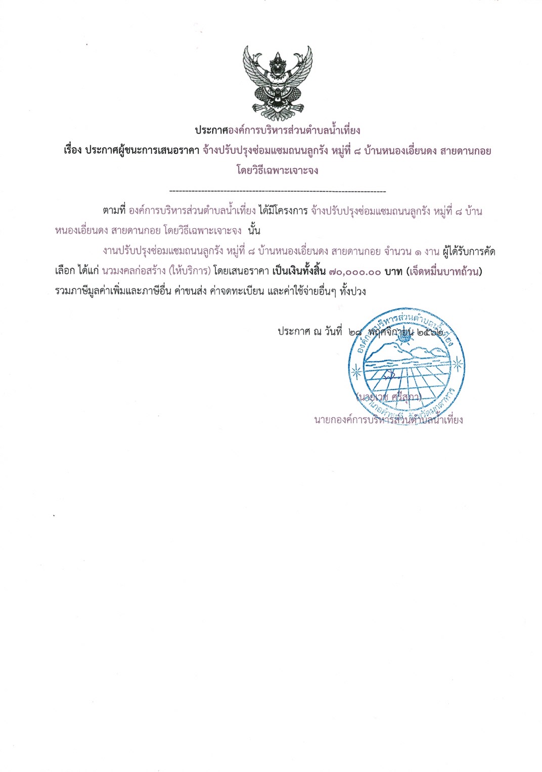 ประกาศผู้ชนะการเสนอราคา จ้างปรับปรุงซ่อมแซมถนนลูกรัง หมู่ที่ 8 บ้านหนองเอี่ยนดง สายดานกอย โดยวิธีเฉพาะเจาะจง