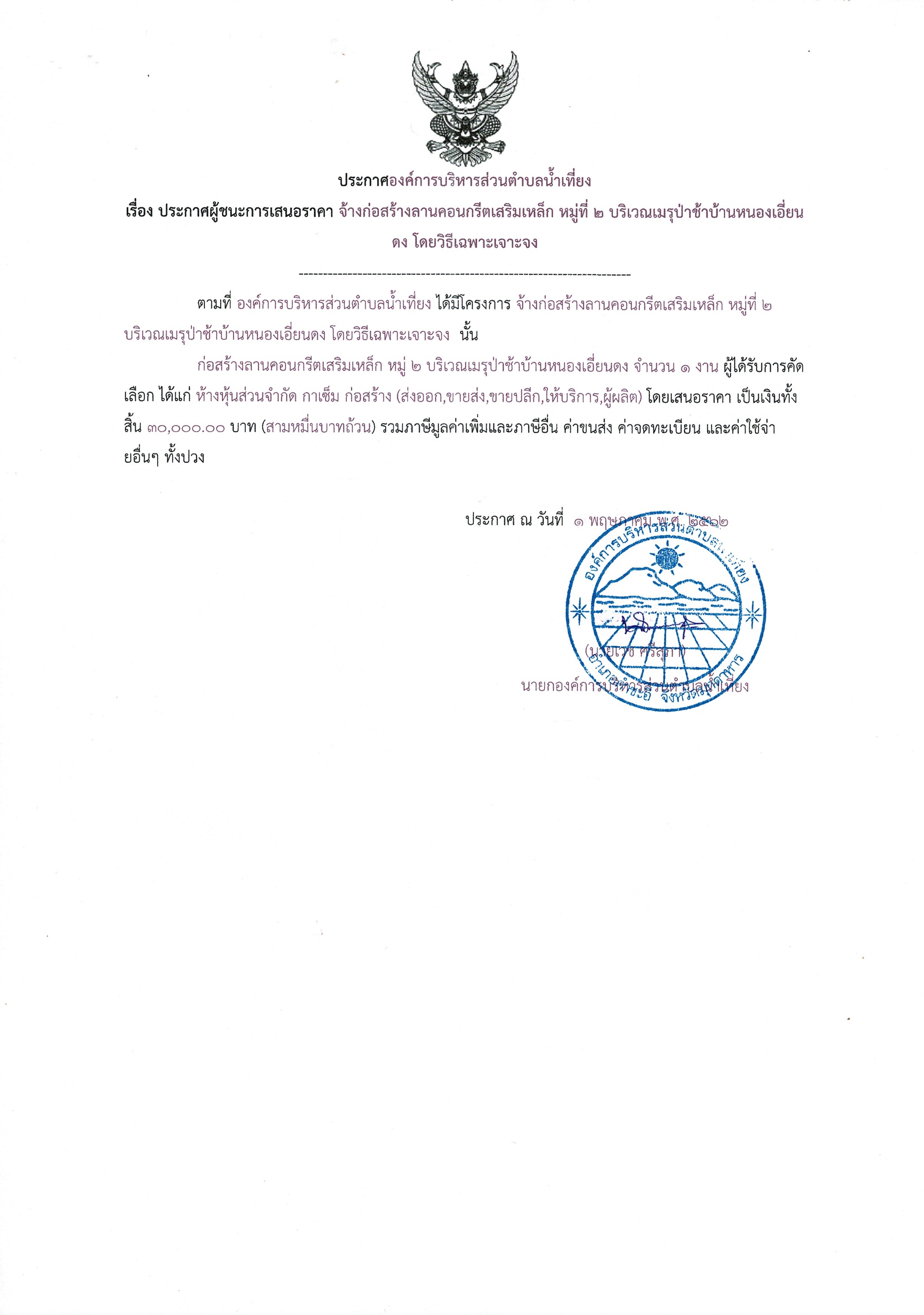 ประกาศผู้ชนะการเสนอราคา จ้างก่อสร้างถนนคอนกรีตเสริมเหล็ก หมู่ 2 บริเวณเมรุป่าช้าบ้านหนองเอี่ยนดง โดยวิธีเฉพาะเจาะจง