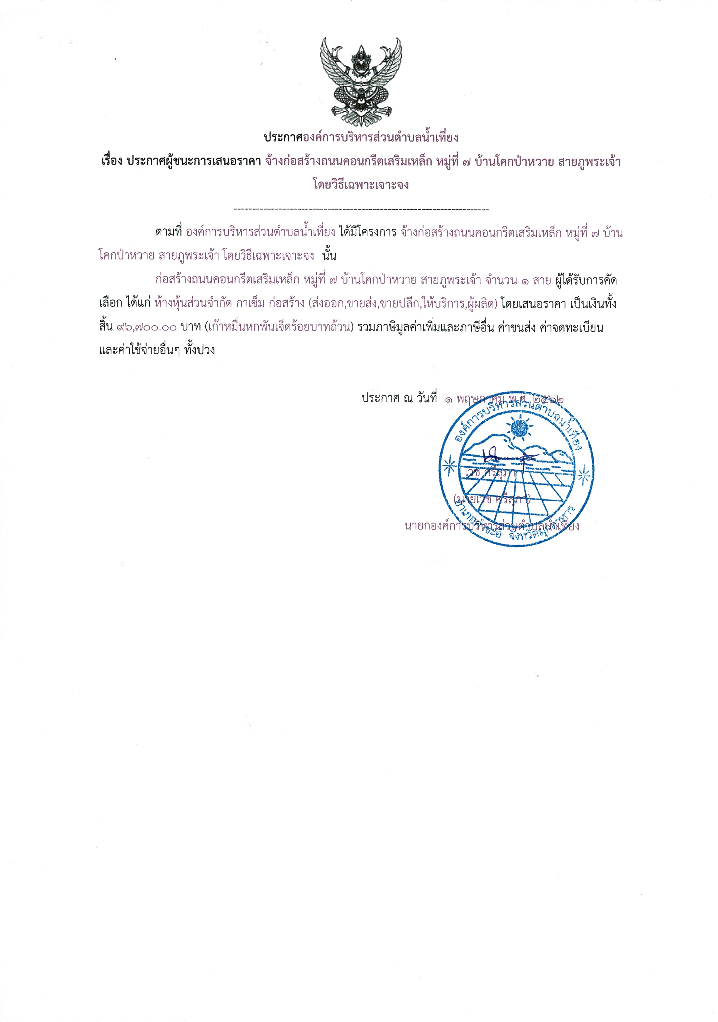 ประกาศผู้ชนะการเสนอราคา จ้างก่อสร้างถนนคอนกรีตเสริมเหล็ก หมู่ที่ 7 บ้านโคกป่าหวาย สายภูพระเจ้า โดยวิธีเฉพาะเจาะจง