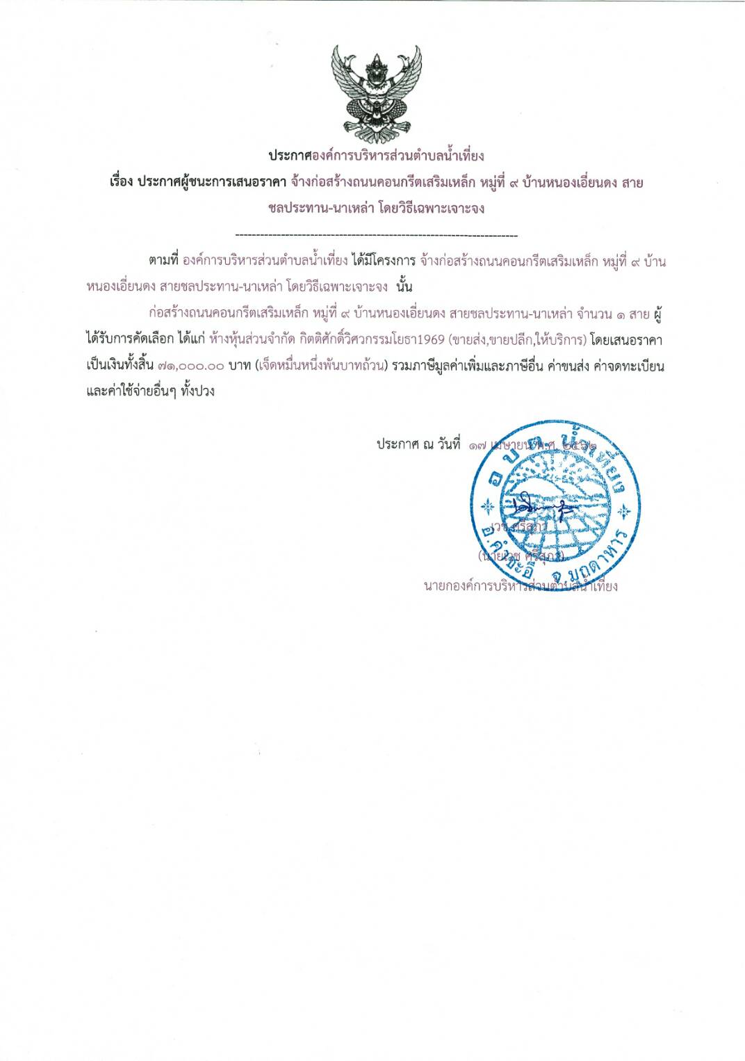 ประกาศผู้ชนะการเสนอราคา จ้างก่อสร้างถนนคอนกรีตเสริมเหล็ก หมู่ที่ 9 บ้านหนองเอี่ยนดง สาย ชลประทาน-นาเหล่า โดยวิธีเฉพาะเจาะจง