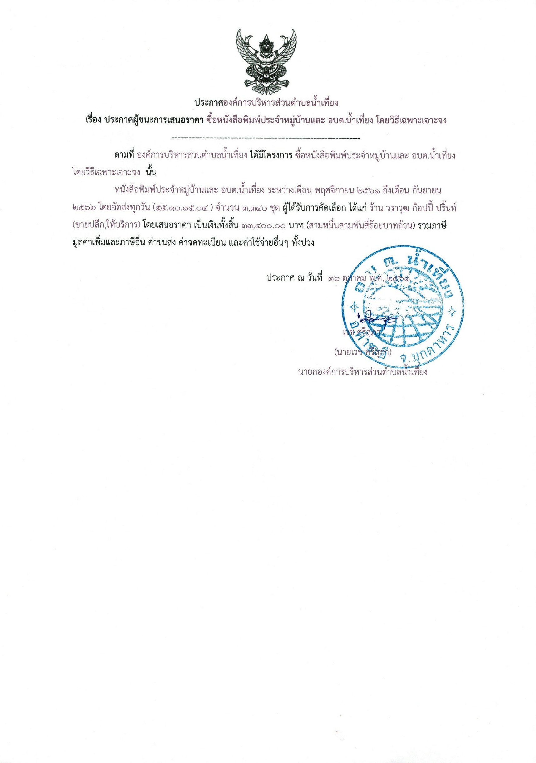 ประกาศผู้ชนะการเสนอราคา ซื้อหนังสือพิมพ์ประจำหมู่บ้านและ อบต.น้ำเที่ยงโดยวิธีเฉพาะเจาะจง