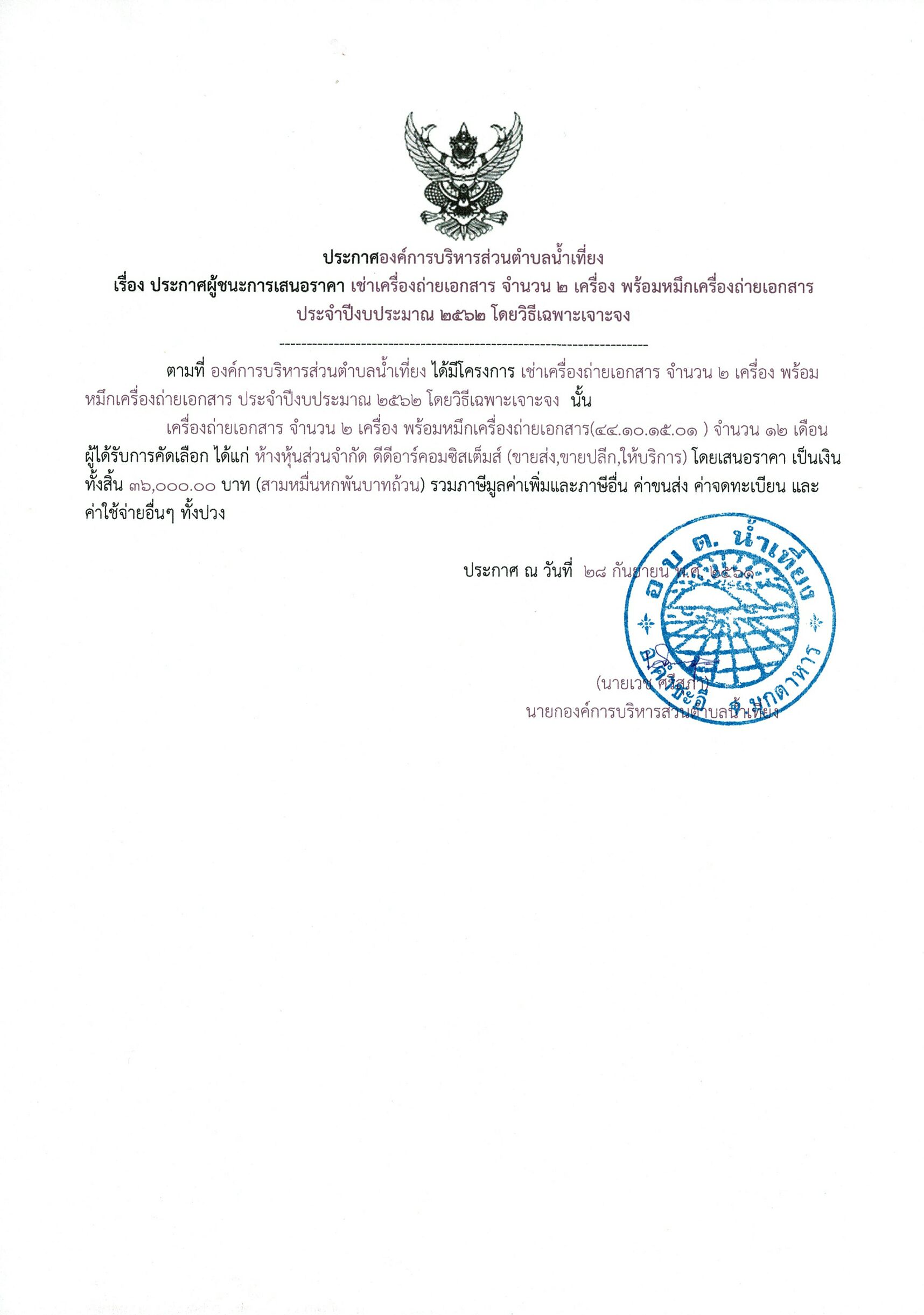 ประกาศผู้ชนะการเสนอราคาเช่าเครื่องถ่ายเอกสารจำนวน ๒ เครื่องพร้อมหมึกเครื่องถ่ายเอกสาร ประจำปีงบประมาณ ๒๕๖๒ โดยวิธีเฉพาะเจาะจง