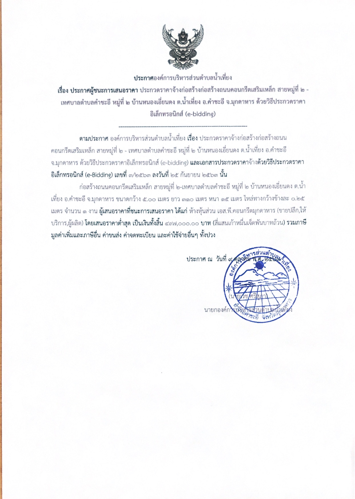 ชื่อเรื่อง : ประกาศผู้ชนะการเสนอราคา ประกวดราจ้างก่อสร้างถนนคอนกรีตเสริมเหล็ก สายหมู่ที่ ๒ - เทศบาลตำบลคำชะอี หมู่ที่ ๒ ตำบลหนองเอี่ยนดง ต.นำเที่ยง อ.คำชะอี จ.มุกดาหาร ด้วยการประกวดราคาอิเล็กทรอนิกส์ (e-bidding)