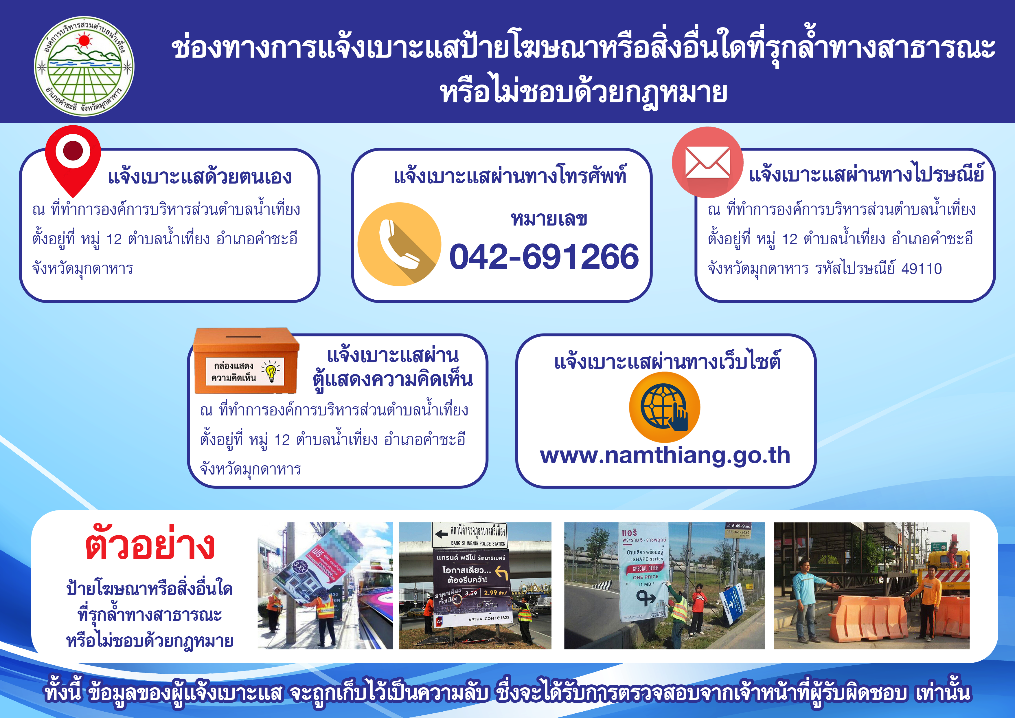 ช่องทางสำหรับการแจ้งเบาะแสป้ายโฆษณาหรือสิ่งอื่นใดที่รุกล้ำทางสาธารณะ หรือไม่ชอบด้วยกฎหมายที่อยู่ในความรับผิดชอบขององค์การบริหารส่วนตำบลน้ำเที่ยง