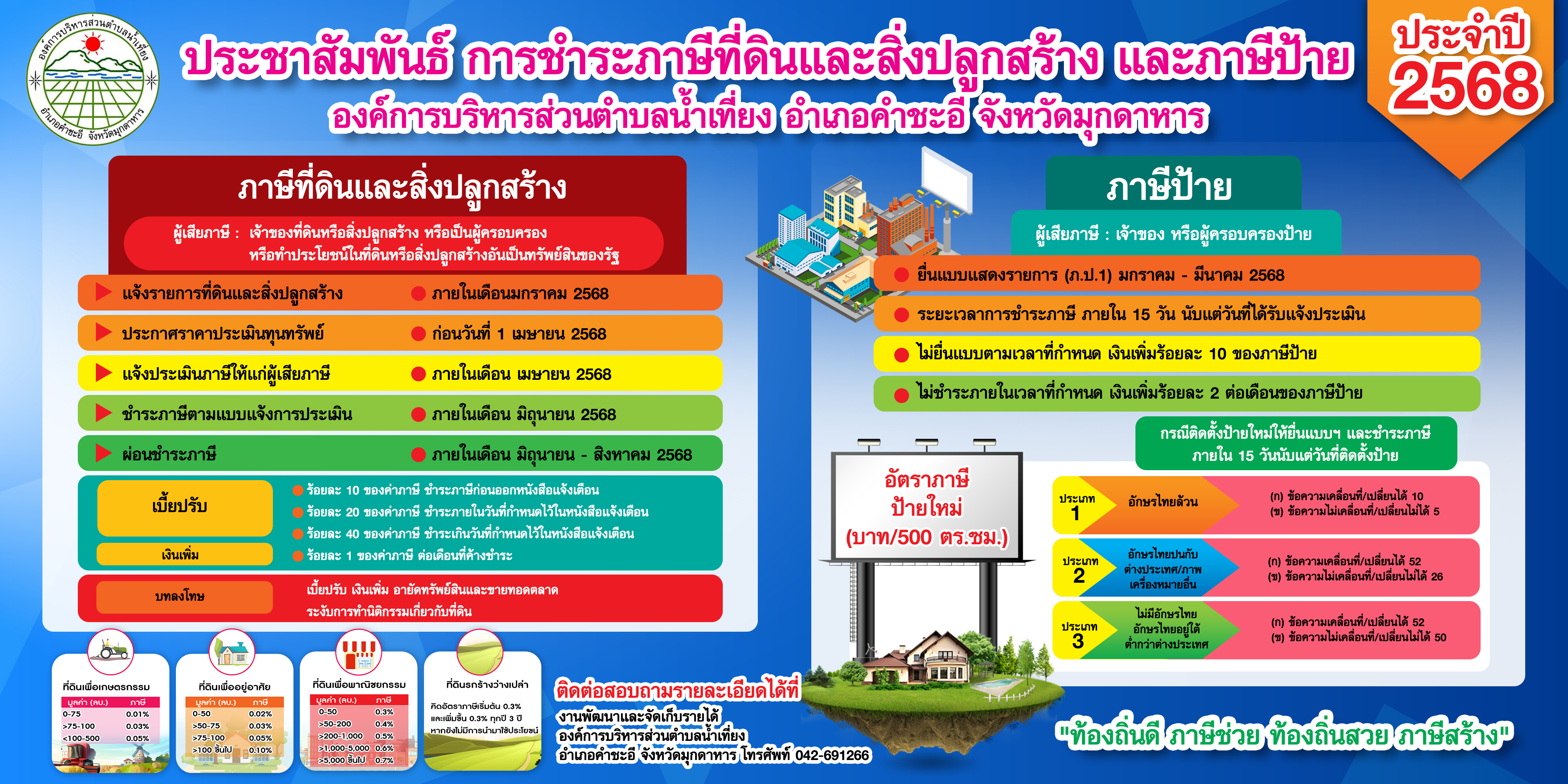 ประชาสัมพันธ์ การชำระภาษีที่ดินและสิ่งปลูกสร้างและภาษีป้าย องค์การบริหารส่วนตำบลน้ำเที่ยง ประจำปี 2568